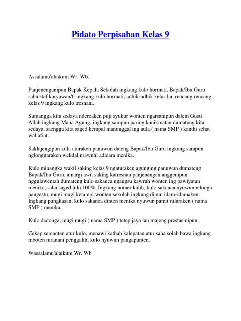 Berikut ini beberapa contoh mengenai pidato bahasa jawa tentang perpisahan sekolah. Contoh pidato perpisahan dari wali murid. Kula wakil sangking siswa kelas 12 ngaturaken sak agengipun maturnuwun dumateng bapak ibu guru, amargi sampun mbulawantah lan maringi kita ngelmu ingkang manfaat sehingga kita saged lulus kanti hasil ingkang. Buatlah pidato perpisahan kelas 9 dari perwakilan kelas 7 dan 8. Contoh pidato bahasa jawa tentang sumpah pemuda.